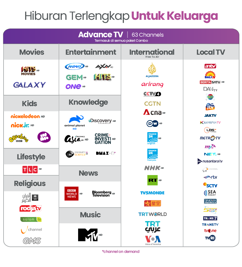 Tayangan berkelas dari channel dalam dan luar negeri seperti box office, drama, sports, kartun, edukasi sampai lifestyle siap menemani waktu santai Anda bersama keluarga. Lengkapi juga Paket TV Kabel terbaik Anda dengan paket Add On Channel yang sesuai kebutuhan Anda.